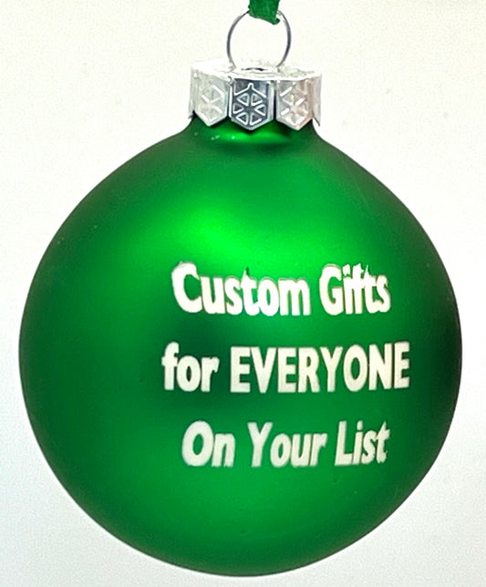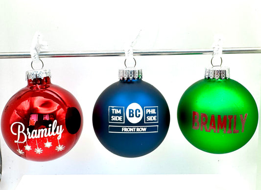 Glass ornaments, laser etched, approximately 2.5 inches in diameter and 100% Bramily. Choose your text and design, ornament color and finish!
